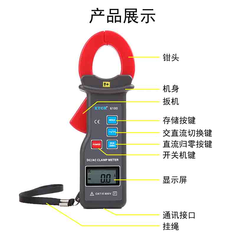 ETCR6100直流/交流鉗形電流表又名鉗形電流表,用于直流、交流電流測量,鉗表采用霍爾感應及數(shù)字集成技術(shù),鉗頭無任何裸露金屬導體,非接觸測量,確保操作安全。廣泛適用于電力、通信、氣象、鐵路、油田、建筑、計量、科研教學單位、工礦企業(yè)等領(lǐng)域,是電工安全檢測的必備工具。