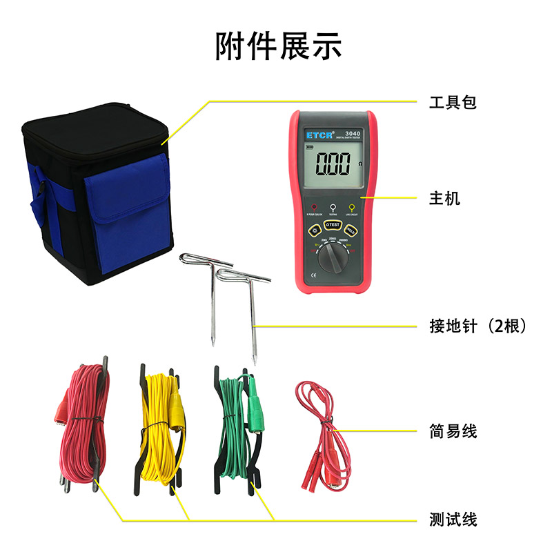 ETCR3040數(shù)字式接地電阻測試儀由主機、測試線等組成。具有自動關機功能、儀表全量程自動換擋、抗干擾能力強、操作更簡易。其廣泛應用于電力、電信、氣象、油田、建筑、防雷及工業(yè)電氣設備等的接地電阻測量。