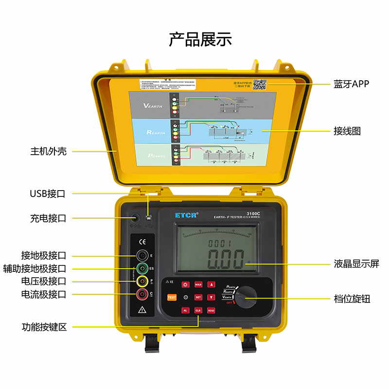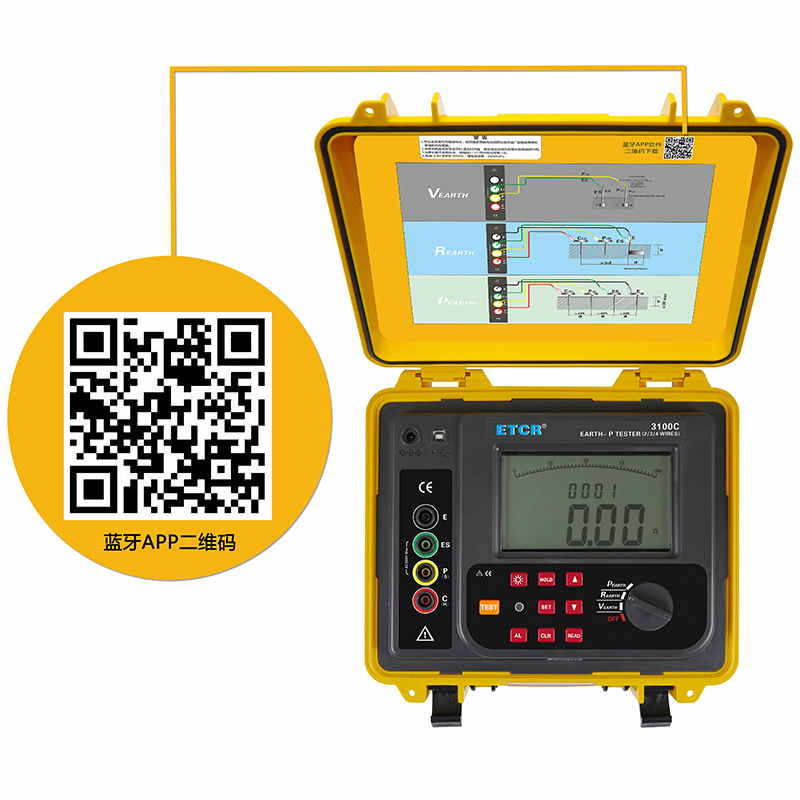 ETCR3100C接地電阻/土壤電阻率測(cè)試儀由主機(jī)、數(shù)據(jù)上傳軟件、測(cè)試線、輔助接地棒、通訊線等組成。儀表外殼采用防水保護(hù)箱,防撞、防摔、防水(防護(hù)等級(jí)IP65)堅(jiān)固安全耐用,儀表還配有大容量可充電鋰電池組,特別適合在戶外工地使用。主機(jī)超大LCD顯示,白屏背光,棒圖指示,一目了然。藍(lán)牙通訊功能,數(shù)據(jù)存儲(chǔ)功能存儲(chǔ)300組數(shù)據(jù),通過(guò)USB接口數(shù)據(jù)上傳軟件實(shí)現(xiàn)歷史查詢與在線實(shí)時(shí)監(jiān)測(cè)功能,動(dòng)態(tài)顯示,告警指示,具有歷史數(shù)據(jù)讀取、查閱、保存、報(bào)表、打印等功能。