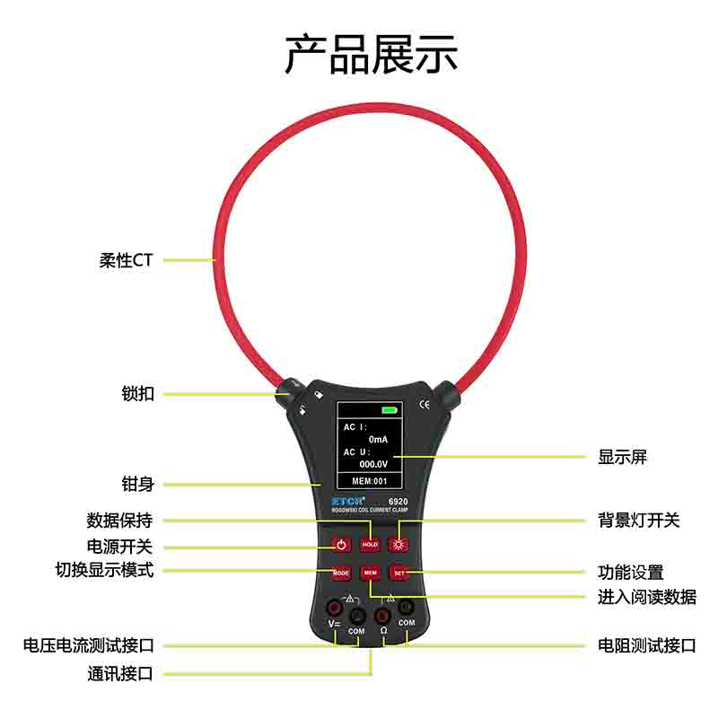 ETCR6920柔性電流鉗表又名柔性線圈鉗表、超大電流鉗表、羅氏線圈電流鉗表、洛氏線圈電流鉗表,用于交流電流測試、電壓測試、電阻測試、通斷測試。柔性線圈無任何裸露金屬導體,體積小、重量輕、柔軟靈活,特別適合大尺寸導體、狹窄環(huán)境和排線密集的場所,可用于信號嚴重畸變的工業(yè)環(huán)境電流測試。廣泛適用于電力、通信、氣象、鐵路、油田、建筑、計量、科研教學單位、工礦企業(yè)等領域。