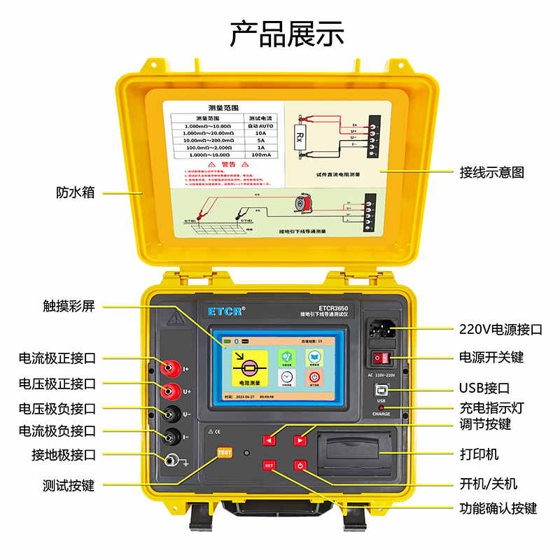 ETCR3650接地引下線導(dǎo)通測(cè)試儀專門(mén)用于接地裝置的電氣完整性測(cè)試,其各項(xiàng)技術(shù)指標(biāo)均達(dá)到或優(yōu)于相關(guān)標(biāo)準(zhǔn)要求。儀器由主機(jī)、測(cè)試線等組成,儀表采用微處理機(jī)技術(shù),精密四線法測(cè)試,準(zhǔn)確可靠。儀表有AC220V及大容量鋰電池兩種供電模式,自動(dòng)測(cè)量及手動(dòng)測(cè)量?jī)煞N測(cè)量模式,儀表采用5寸全彩高清觸摸屏,帶背光調(diào)節(jié)功能,強(qiáng)光下清晰可見(jiàn)。儀表外殼采用防水保護(hù)箱,防撞、防摔、防水堅(jiān)固安全耐用,儀表帶有內(nèi)置打印機(jī)、藍(lán)牙通訊,USB接口。儀器操作簡(jiǎn)單方便、精度高、測(cè)試速度快,復(fù)測(cè)性好、讀數(shù)直觀,是符合規(guī)程要求的理想的專用儀器,大大方便了試驗(yàn)項(xiàng)目的開(kāi)展,提高了工作效率。