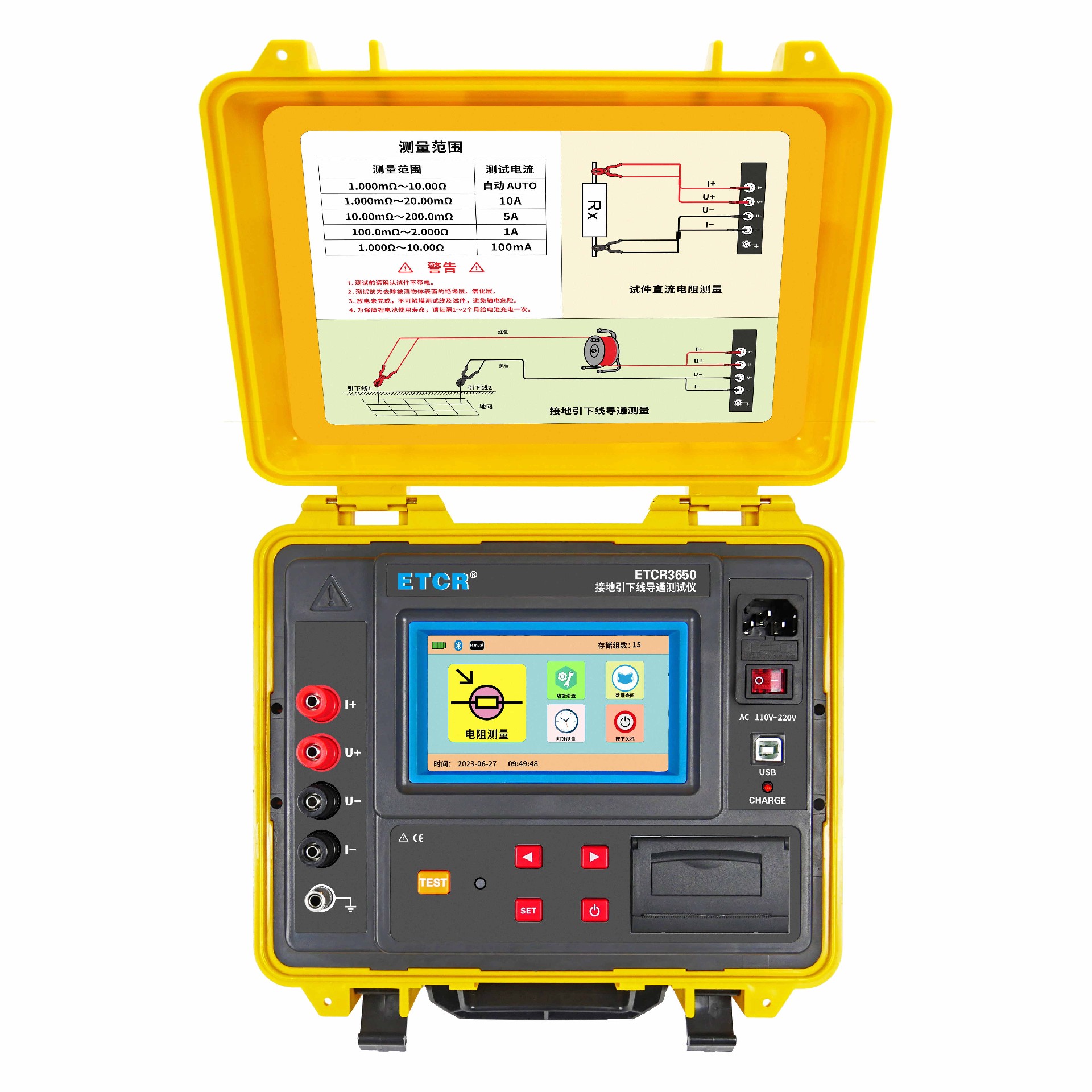 ETCR3650接地引下線導(dǎo)通測(cè)試儀適用于電力設(shè)備接地引下線與接地網(wǎng)(或相鄰設(shè)備)之間導(dǎo)通電阻值的測(cè)量,可有效檢測(cè)電氣設(shè)備與地網(wǎng)之間引線電阻因各種原因引起的電阻值增大的情況,以免造成設(shè)備失地運(yùn)行。電力行業(yè)標(biāo)準(zhǔn) DL/T475-2017《接地裝置特性參數(shù)測(cè)量導(dǎo)則》規(guī)定:電氣導(dǎo)通性應(yīng)選用專門(mén)的儀器進(jìn)行測(cè)量,儀器分辨率為 1mΩ,準(zhǔn)確度不低于 1.0 級(jí)。