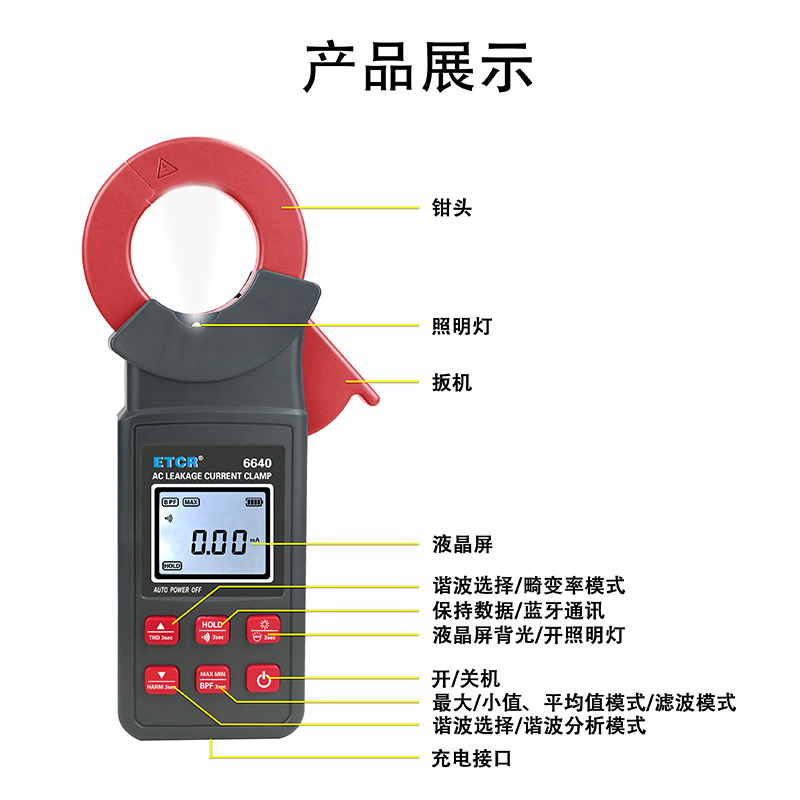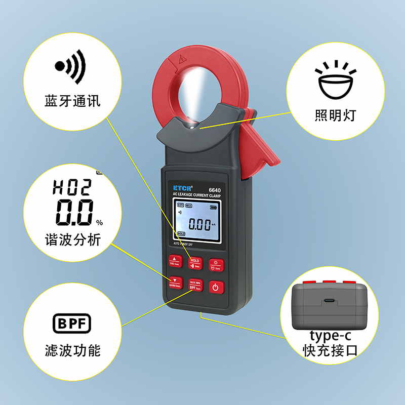 ETCR6640鉗形漏電流表可測試40Hz~1kHz頻率范圍的電流。鉗表還具有背光、手電筒、數(shù)據(jù)存儲、藍(lán)牙通訊等功能。鉗表使用大容量鋰電池type-c充電口,是一款新型的電工安全檢測必備工具。