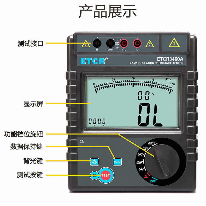 ETCR3460A絕緣電阻表又名兆歐表、絕緣電阻測試儀,用于絕緣電阻測試。儀表具有LCD大屏幕帶背光顯示、數據保持、自動放電、自動關機等功能。儀表具有測試計時,電壓監(jiān)測功能,回路電壓大于36V時,儀表將禁止測試以保護被測物及人員安全。儀表功能操作簡易,絕緣電阻值,測試時間,輸出電壓同屏顯示,具備交流電壓、直流電壓測試功能。