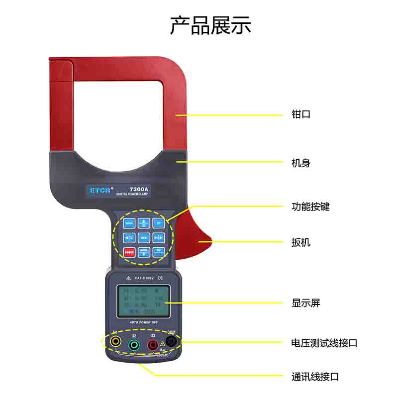 ETCR7300A大口徑三相鉗形功率表又名鉗形功率計(jì)、超大口徑鉗形功率表、三相鉗形功率表,用于現(xiàn)場測量三相交流電壓、電流、電壓間相位、電壓電流間相位、頻率、相序、電能、有功功率、無功功率、視在功率、功率因數(shù)、總功率等電能參數(shù)。還能用于判別變壓器接線組別、感性、容性電路,讀出差動(dòng)保護(hù)各組CT之間的相位關(guān)系,檢查電度表的接線正確與否,檢修線路設(shè)備等,為用電檢查人員提供一種安全、準(zhǔn)確、便捷的新型電力儀表。