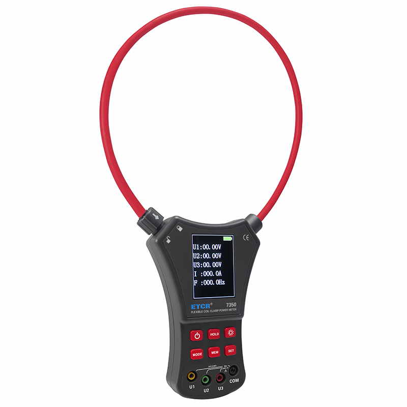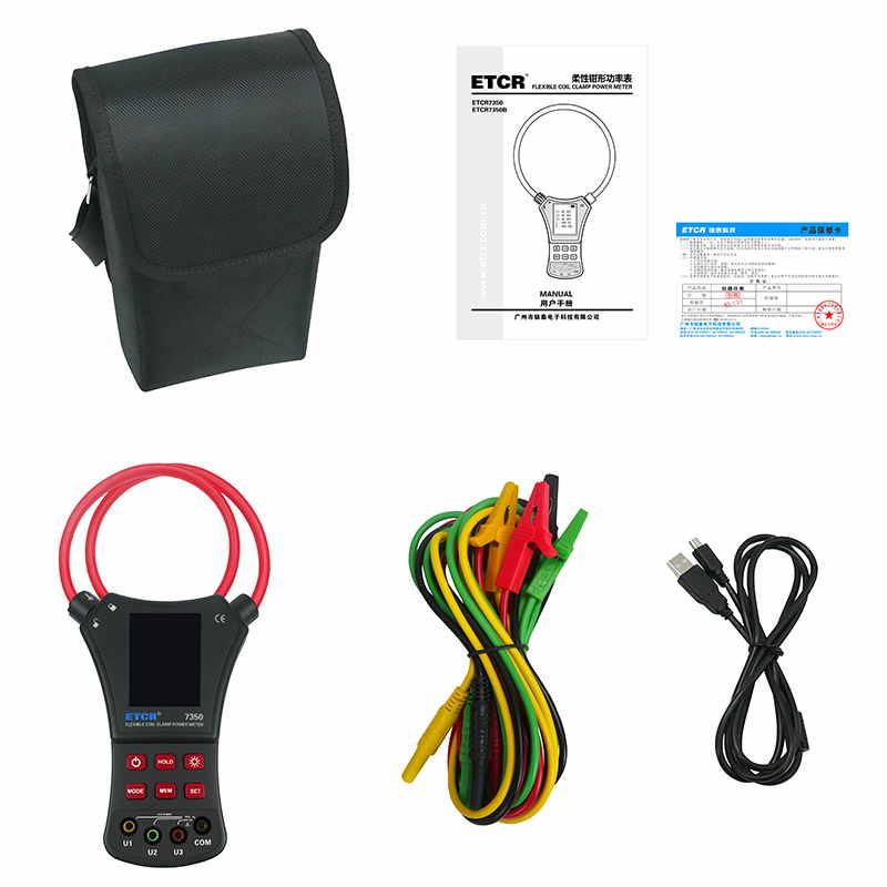 ETCR7350柔性鉗形功率表又名羅氏線圈功率表、洛氏線圈功率表,用于現(xiàn)場測量三相交流電壓、電流、電壓間相位、電壓電流間相位、頻率、相序、電能、有功功率、無功功率、視在功率、功率因數(shù)、總功率等電能參數(shù)。還能用于判別變壓器接線組別、感性、容性電路,讀出差動保護(hù)各組CT之間的相位關(guān)系,檢查電度表的接線正確與否,檢修線路設(shè)備等,為用電檢查人員提供一種安全、準(zhǔn)確、便捷的新型電力儀表。