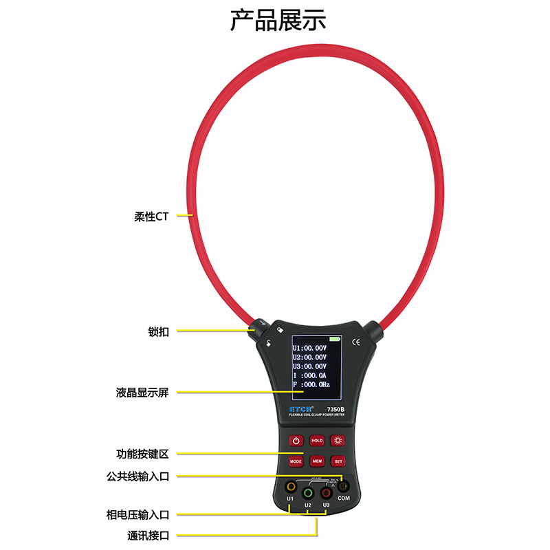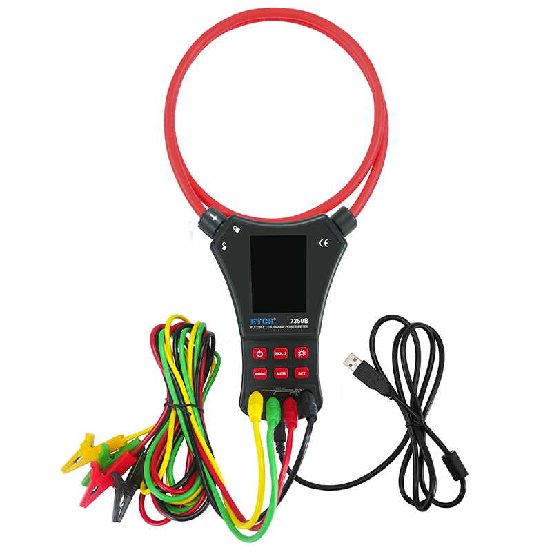 ETCR7350B柔性鉗形功率表又名羅氏線圈功率表、洛氏線圈功率表,用于現(xiàn)場測量三相交流電壓、電流、電壓間相位、電壓電流間相位、頻率、相序、電能、有功功率、無功功率、視在功率、功率因數(shù)、總功率等電能參數(shù)。還能用于判別變壓器接線組別、感性、容性電路,讀出差動保護(hù)各組CT之間的相位關(guān)系,檢查電度表的接線正確與否,檢修線路設(shè)備等,為用電檢查人員提供一種安全、準(zhǔn)確、便捷的新型電力儀表。
