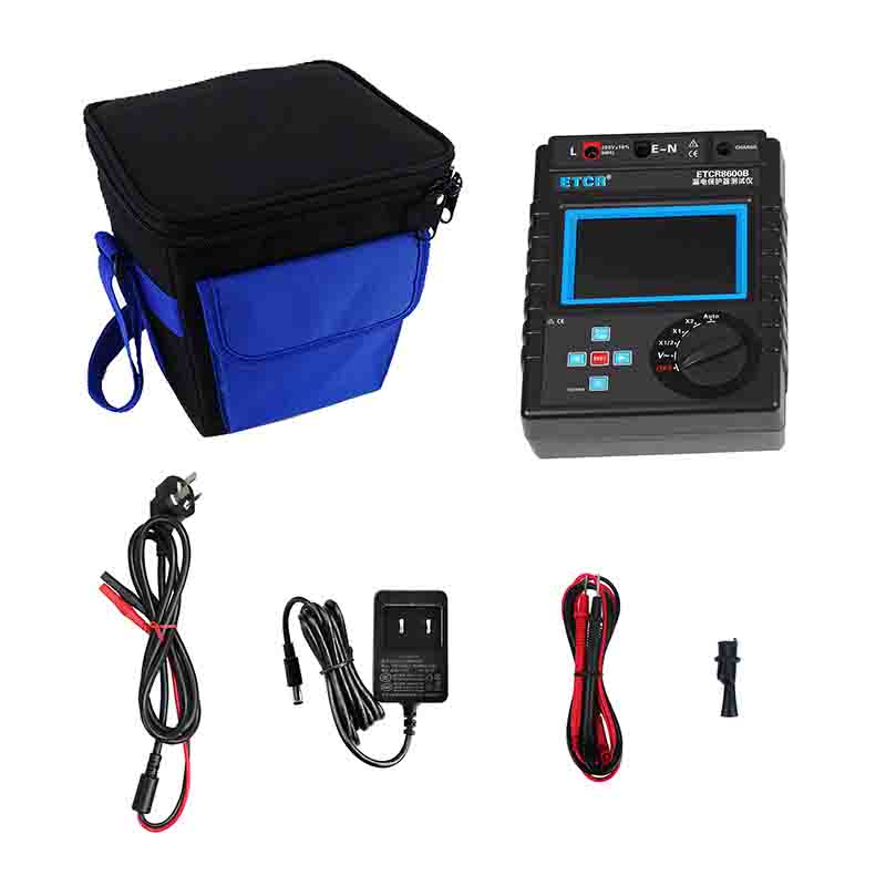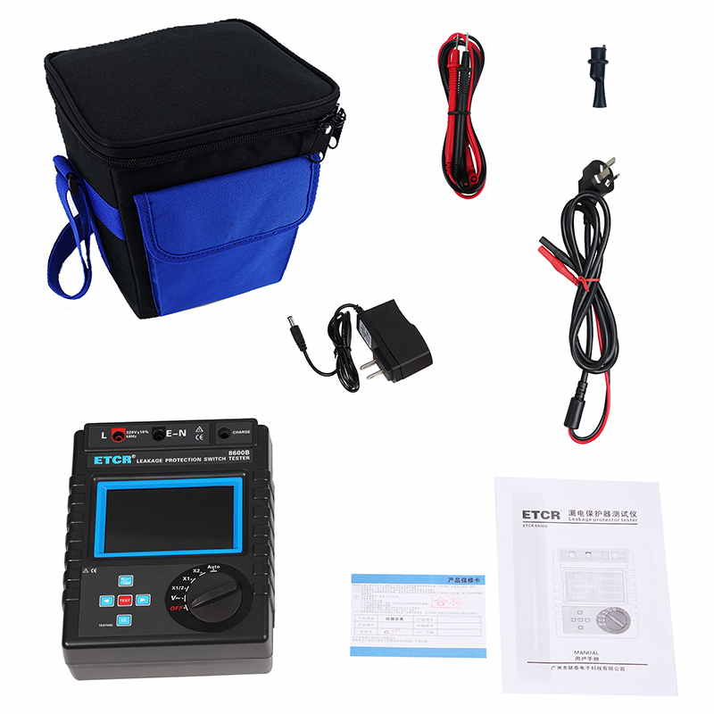 ETCR8600B漏電保護(hù)器測(cè)試儀又稱(chēng)漏電開(kāi)關(guān)測(cè)試儀、漏電開(kāi)關(guān)特性測(cè)試儀,用于現(xiàn)場(chǎng)在線(xiàn)測(cè)試各種漏電保護(hù)器的漏電動(dòng)作時(shí)間、以及線(xiàn)路交流電壓。測(cè)試電流從5mA~1000mA分16檔(5mA、10mA、15mA、20mA、30mA、40mA、50mA、60mA、100mA、150mA、200mA、250mA、300mA、500mA、600mA、1000mA),測(cè)試漏電流動(dòng)作時(shí)間量程為0~999ms。交流電壓量程:0~600V。