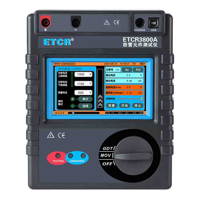 ETCR3800A智能型防雷元件測(cè)試儀又稱防雷元件測(cè)試表、SPD現(xiàn)場(chǎng)測(cè)試儀、壓敏電阻測(cè)試儀、浪涌保護(hù)器測(cè)試儀,用于測(cè)量各種壓敏電阻(MOV)、氣體放電管(GDT)、浪涌保護(hù)器(SPD)性能參數(shù)測(cè)試,儀表具有獨(dú)特的高壓短路保護(hù)、過(guò)流保護(hù)功能,專業(yè)級(jí)的參數(shù)設(shè)置功能、高壓限值設(shè)定、升壓速度設(shè)定、合格范圍設(shè)定、合格判斷篩選、自動(dòng)量程調(diào)節(jié)等功能。還具有單件測(cè)試模式、連續(xù)測(cè)試模式功能,特別適合批量元件測(cè)試。儀器廣泛用于避雷器、防雷器、浪涌保護(hù)器、壓敏電阻、金屬陶瓷放電管、真空避雷管等過(guò)壓防護(hù)元件性能參數(shù)的測(cè)試。是氣象防雷、電力、通信、機(jī)電安裝和維修、防雷元件生產(chǎn)廠家、以及工業(yè)企業(yè)部門常用必備的儀表。