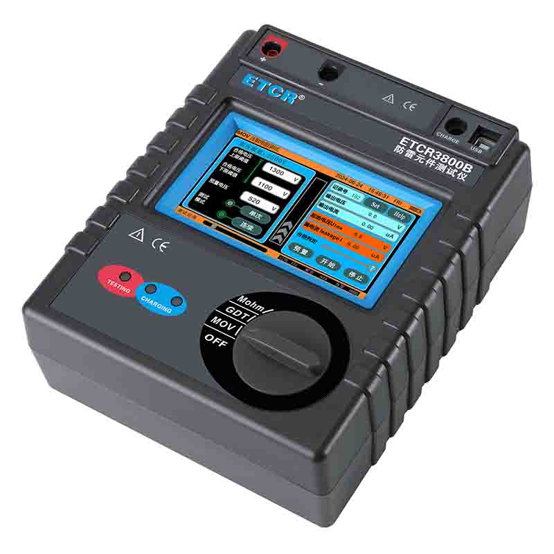 ETCR3800B智能型防雷元件測試儀又稱防雷元件測試表、SPD現(xiàn)場測試儀、壓敏電阻測試儀、浪涌保護(hù)器測試儀,用于測量各種壓敏電阻(MOV)、氣體放電管(GDT)、浪涌保護(hù)器(SPD)性能參數(shù)測試,還具有絕緣電阻、吸收比、極化指數(shù)測試功能。儀表具有獨(dú)特的高壓短路保護(hù)、過流保護(hù)功能,專業(yè)級(jí)的參數(shù)設(shè)置功能、高壓限值設(shè)定、升壓速度設(shè)定、合格范圍設(shè)定、合格判斷篩選、自動(dòng)量程調(diào)節(jié)等功能。還具有單件測試模式、連續(xù)測試模式功能,特別適合批量元件測試。儀器廣泛用于避雷器、防雷器、浪涌保護(hù)器、壓敏電阻、金屬陶瓷放電管、真空避雷管等過壓防護(hù)元件性能參數(shù)的測試。是氣象防雷、電力、通信、機(jī)電安裝和維修、防雷元件生產(chǎn)廠家、以及工業(yè)企業(yè)部門常用必備的儀表。
