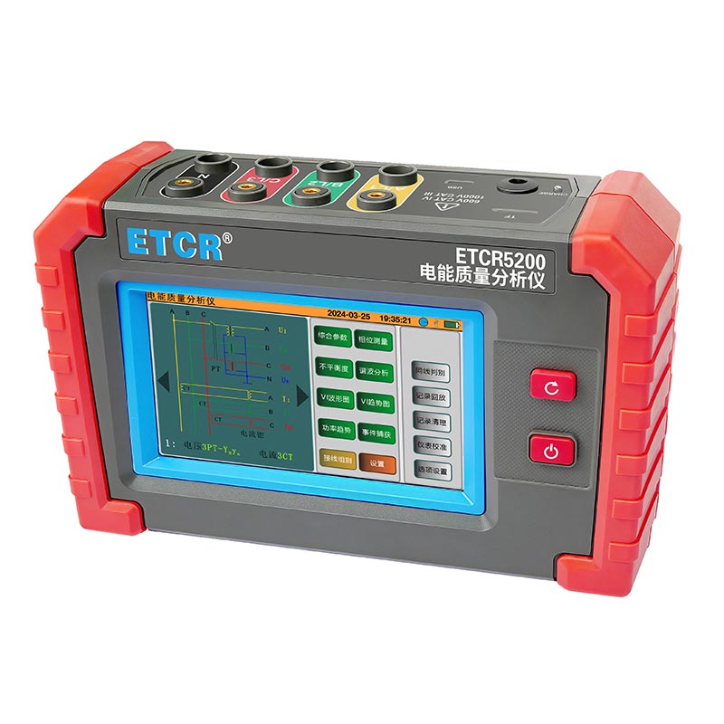 ETCR5200迷你型電能質量分析儀又稱電力質量分析儀、電力參數(shù)測試儀、諧波分析儀,是一款專為現(xiàn)場測試三相電能質量的高精度綜合型測試儀器。儀表具有智能化、功能完善、人機操作簡潔、中英文雙語操作界面等特點。儀表采用5寸觸摸彩屏、體積小重量輕、攜帶方便,可選配多款電流鉗。儀表可同時測量4路電流(ABC三相及中性線電流),3路電壓、三相不平衡度、有功功率、無功功率、視在功率、諧波比、總諧波失真度等;顯示電流電壓的實時波形、相量圖;動態(tài)捕捉電壓電流瞬時變化,監(jiān)測啟動電流,監(jiān)測各電力參數(shù)并生成告警列表,長時間記錄測試數(shù)據(jù)并生成趨勢曲線圖等功能。適用于電力、石化、冶金、鐵路、工礦企業(yè)、科研院校、計量部門等。