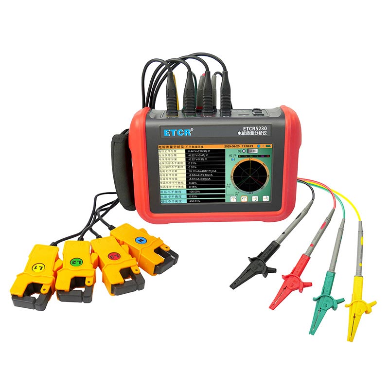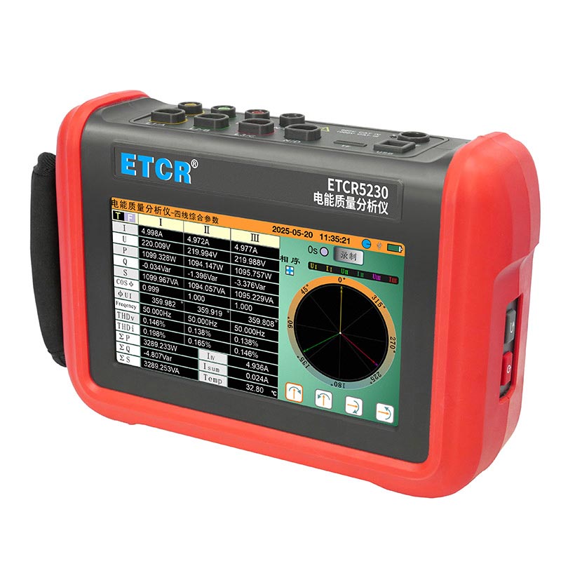 ETCR5230電能質(zhì)量分析儀是我公司精心研制的一款專為現(xiàn)場測試三相電能質(zhì)量的高精度綜合型測試儀器。儀表具有智能化、功能完善、人機(jī)操作簡潔、中英文雙語操作界面等特點(diǎn)。儀表采用7寸觸摸彩屏、體積小重量輕、攜帶方便,可選配多款電流鉗。儀表可同時測量4路電流(ABC三相及中性線電流),3路電壓、三相不平衡度、有功功率、無功功率、視在功率、諧波比、總諧波失真度等;顯示電流電壓的實(shí)時波形、相量圖;動態(tài)捕捉電壓電流瞬時變化,監(jiān)測啟動電流,監(jiān)測各電力參數(shù)并生成告警列表,長時間記錄測試數(shù)據(jù)并生成趨勢曲線圖等功能。