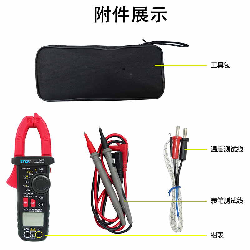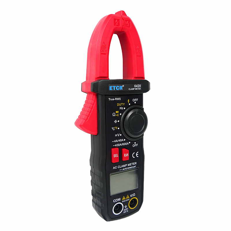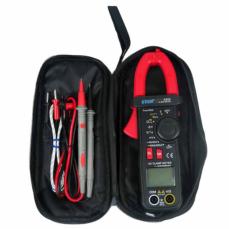 ETCR6420鉗形萬用表又稱多功能鉗形電流表,是一種便攜式鉗形數(shù)字多用表,可測量直流電壓、交流電壓電流真有效值、電阻、頻率、通斷測試、溫度、二極管正向壓降等參數(shù),電容測量量程擴大到10mF且測量大電容速度快。該儀表結構小巧、操作容易、攜帶方便,是電氣測量之理想工具。為用電檢查人員提供一種安全、準確、便捷的新型電力儀表,是電工安全檢測的必備工具。