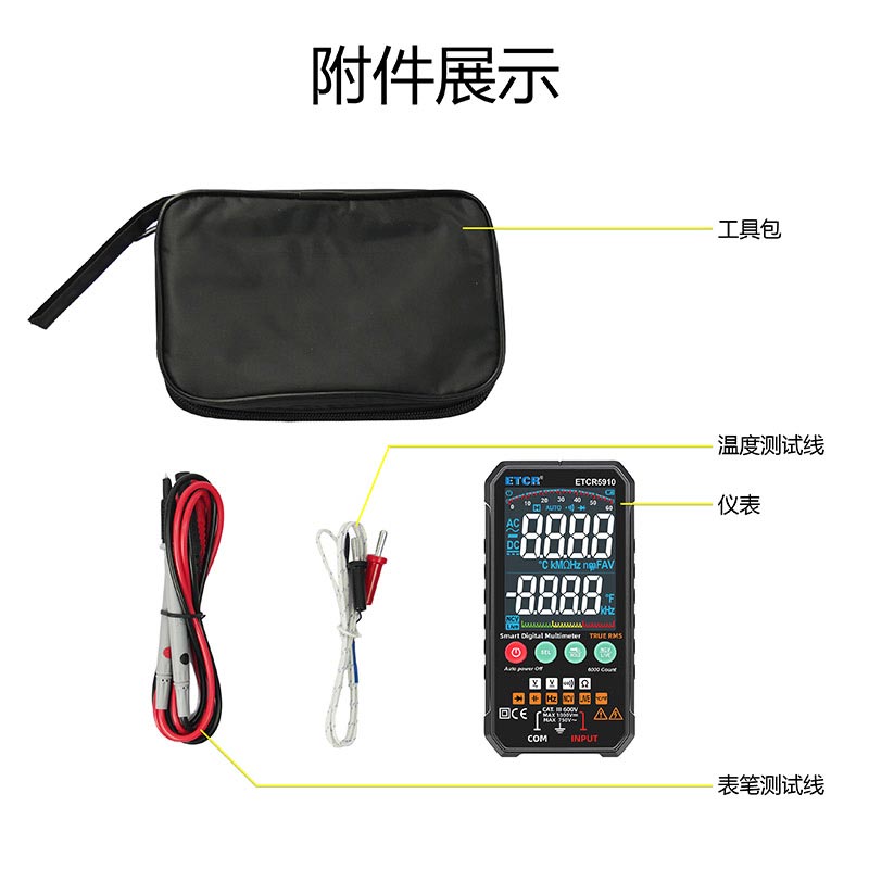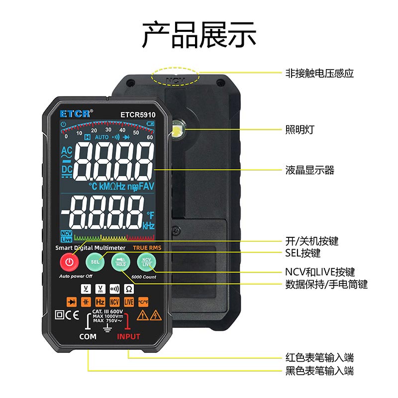 1. 便攜式6000計(jì)數(shù)自動(dòng)量程數(shù)字多用表,全新設(shè)計(jì),結(jié)構(gòu)精巧、操作容易、攜帶方便,是電工電子測(cè)量之理想工具。