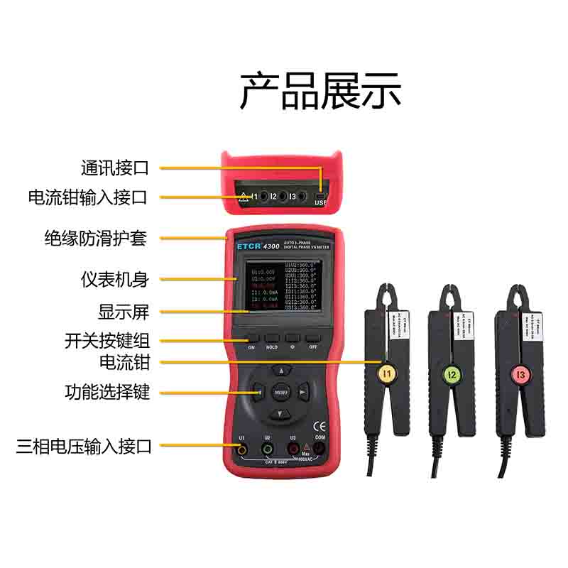 ETCR4300三相數字相位伏安表采用2.8寸TFT彩色液晶屏,動態(tài)顯示,向量圖指示,一目了然。其尖小形電流鉗鉗口適用于排線密集的場所。儀表的智能化設計減少了操作的繁瑣性,降低了誤操作的可能性,測試精度高、使用方便。儀表配有的防振防滑高絕緣護套,USB通訊接口,可存儲1200組數據,通過系統軟件上傳所存數據到電腦,實現在線實時監(jiān)測與歷史查詢,讀取、保存、報表、打印歷史數據等。