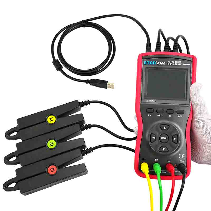 ETCR4300三相數字相位伏安表又稱三鉗相位伏安表、三相相位伏安測試儀、手持式相位測試儀、便攜式相位表 、矢量圖分析儀,用于同時測量三相交流電壓、電流、電壓間相位、電流間相位、電壓電流間相位、頻率、相序、有功功率、無功功率、視在功率、功率因數、電流矢量和,判別變壓器接線組別、感性、容性電路,測試二次回路和母差保護系統,讀出差動保護各組CT之間的相位關系,檢查電度表的接線正確與否,檢修線路設備等,為用電檢查人員提供一種安全、準確、便捷的新型電力儀表。尤其適用于電能計費系統及繼電保護系統。