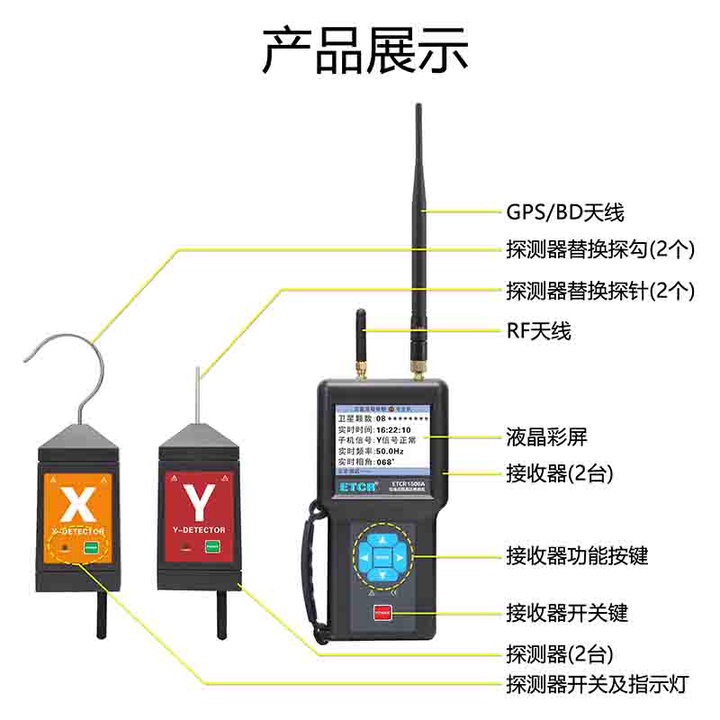 ETCR1500A遠程高壓核相儀由2個主機、2個探測器、伸縮絕緣桿、監(jiān)測軟件等組成,主機采用3.5寸真彩液晶屏,可以同屏顯示相位、頻率、相序及核相結(jié)果,向量圖指示、相位指示清晰直觀;具有“X信號正常、Y信號正常、同相、異相”語音提示功能,使測試更簡單輕松。