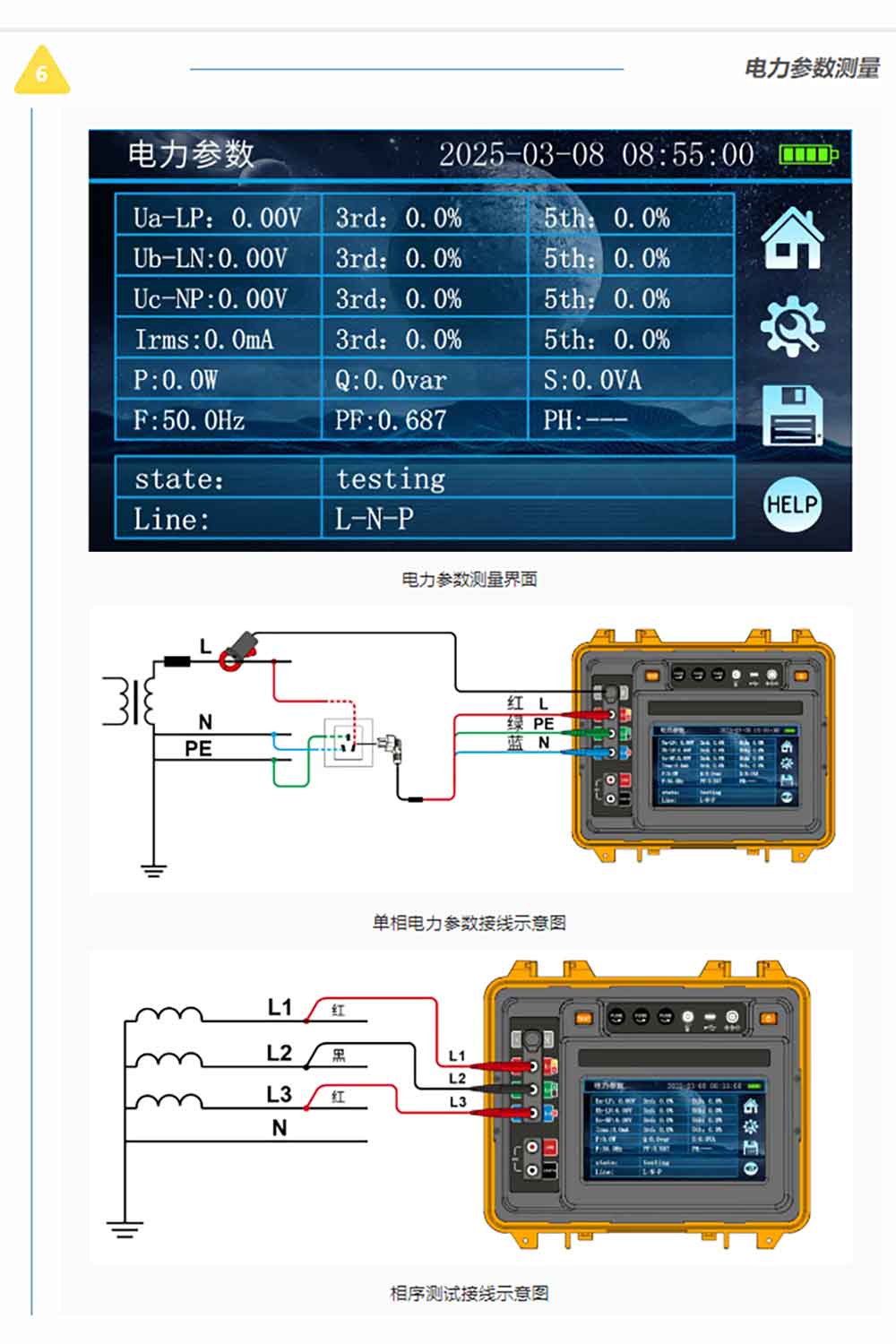 接地/絕緣/直流電阻測(cè)試、RCD漏電保護(hù)檢測(cè)、電氣插座檢測(cè)、電流有效值測(cè)試、交流電壓測(cè)試、相序測(cè)試等電力參數(shù)測(cè)試。